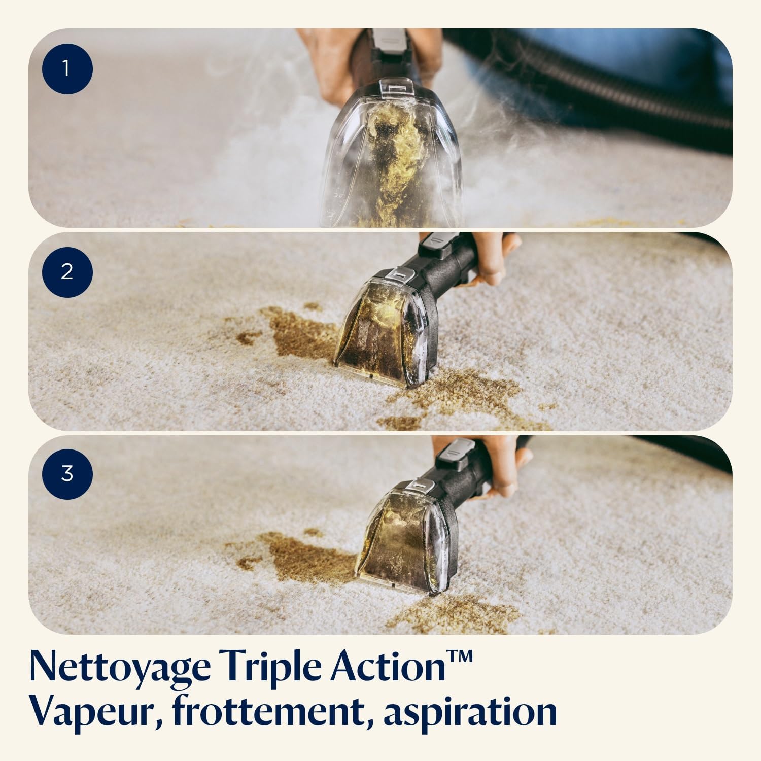 - SYSTÈME DE NETTOYAGE TRIPLE ACTION : Le nettoyeur vapeur combine la vapeur, le brossage et une aspiration puissante pour éliminer saletés, taches et impuretés des tapis, meubles rembourrés, joints de carrelage, et plus encore