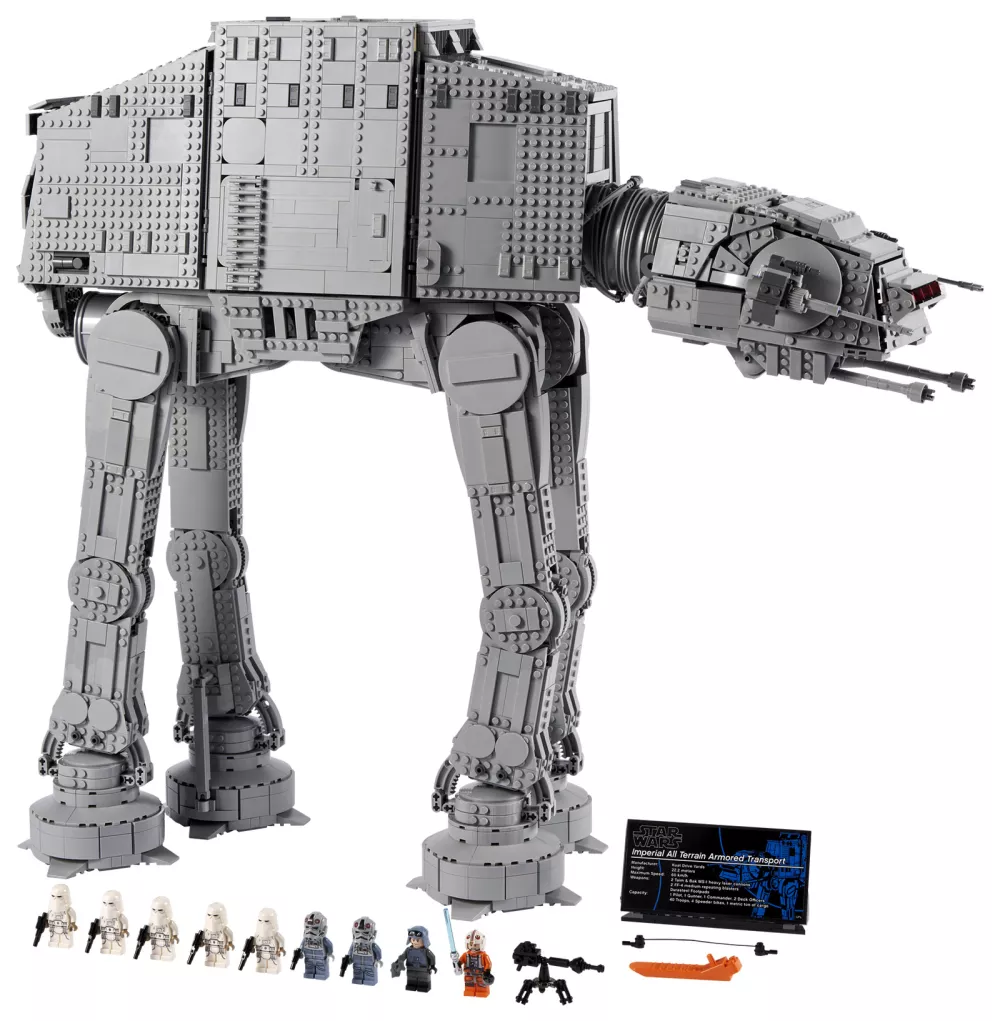 Ce modèle de plus de 62 cm de haut s’ouvre facilement pour révéler un intérieur détaillé. Le corps principal peut accueillir jusqu’à 40 figurines LEGO® (dont 9 sont incluses : General Veers, Luke Skywalker, un commandant Snowtrooper, 4 Snowtroopers et 2 pilotes d’AT-AT), 4 speeder bikes (2 inclus), ainsi qu’un canon lourd E-Web. La tête/cockpit peut asseoir 2 figurines avec une place supplémentaire. Une plaque d’information accompagne ce superbe objet de collection.