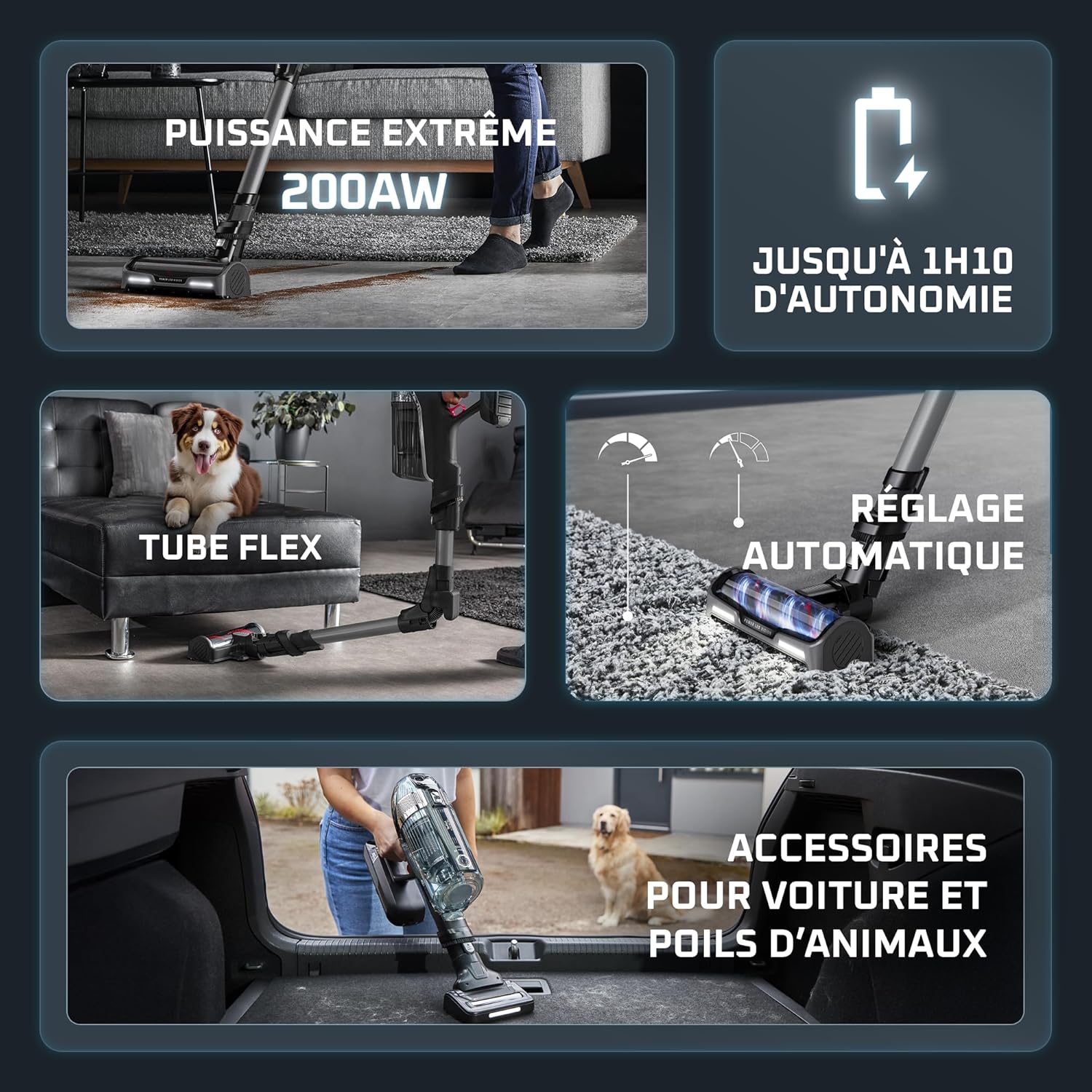 Nettoyez jusqu’à 4 fois plus loin sous les meubles, Plus d’une heure d’autonomie, Une filtration optimale, Moteur DigitalForce, Kit Animal et accessoires pratiques, Réglez sa puissance et contrôlez son autonomie, Une puissance d’aspiration sur tous les sols, Facile d’entretien, sans filtreNettoyez jusqu’à 4 fois plus loin sous les meubles, Plus d’une heure d’autonomie, Une filtration optimale, Moteur DigitalForce, Kit Animal et accessoires pratiques, Réglez sa puissance et con… Voir plus |